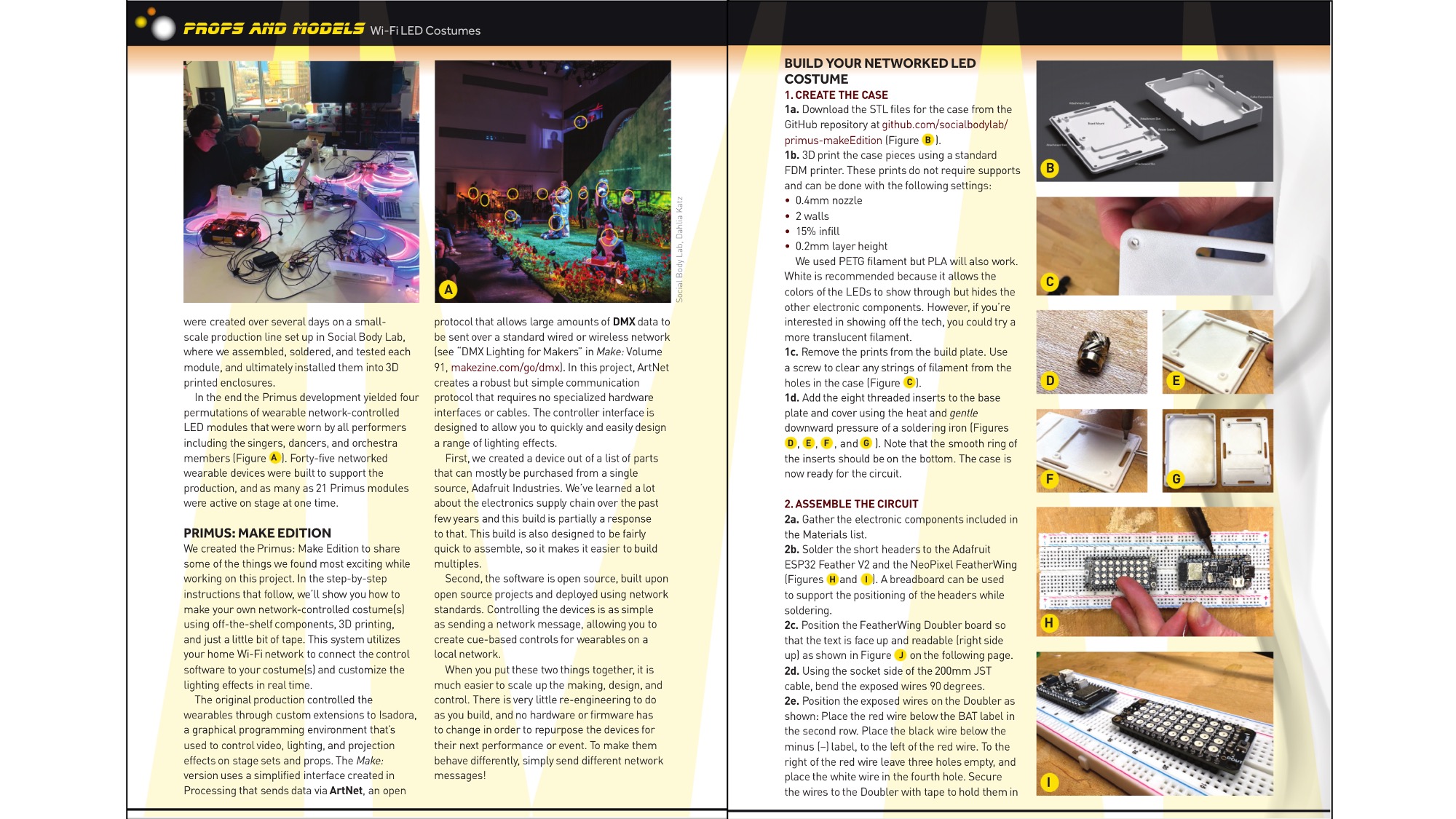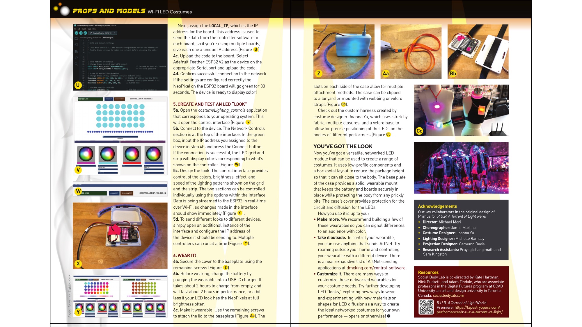 "LEDs are a go-to when it comes to wearable electronics projects. Everyone loves to wear a splash of light now and then. But how might you design dynamic wearable lighting effects for a professional on-stage performance? How could the circuitry be made robust enough to survive bodies of sweaty dancers and the wear and tear of multiple shows? What if many wearables worn by multiple performers could be controlled to each display synchronized but unique patterns by the same software that operates the stage lighting? In this article, published in Make Magazine: Volume 94, we show how to make your own network-controlled costume(s) using off-the-shelf components, 3D printing, and just a little bit of tape. The system utilizes your home WiFi to connect the control software to your costume(s) and customize the lighting effects in real time. This system is based on networked LED costume elements that Social Body Lab developed for Tapestry Opera's production ""R.U.R. A Torrent of Light"", where the wearables were worn by opera singers and dancers playing the role of robots. The version described in this article uses a simplified interface created in Processing that sends data via the ArtNet protocol. ArtNet is an open protocol that allows large amounts of DMX data to be sent over a standard wired or wireless network. In this project, it is used to create a robust, but simple communication protocol between the controller and the hardware that does not require specialized hardware interfaces or cables. The controller interface is designed to allow you to quickly and easily design a range of lighting effects which are then wirelessly communicated to each wearable device. "