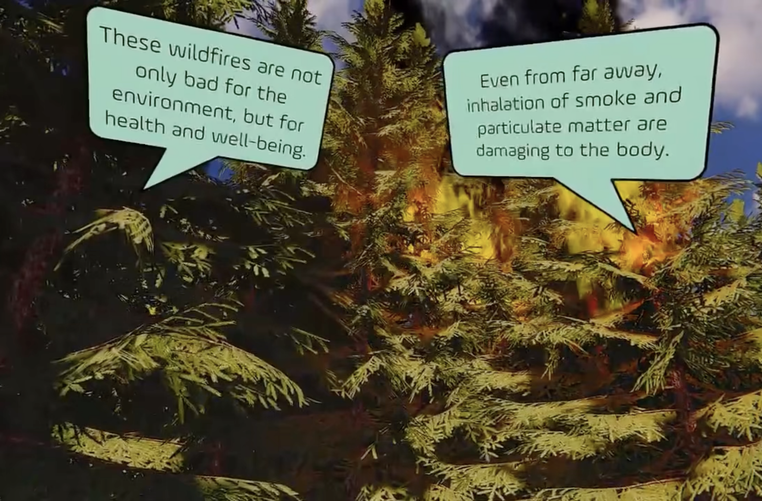 Wildfire VR is an educational tool to teach any audience about wildfires as their severity ramps up each year with the effects of climate change drastically increasing. The experience takes the user through an ongoing wildfire on an island. Whilst educating the user with prompted questions and facts, they are free to follow the wildfire or explore the terrain. This virtual reality experience is a project prototype created as part of a larger project for prof. Michael Page in the PHASE Lab.